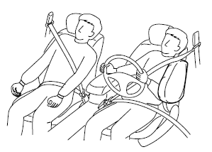 Lorsque les détecteurs de choc des coussins d'air détectent un choc latéral important, le système gonfle le coussin d'air latéral seulement du côté où le véhicule a subi le choc. Le coussin d'air latéral se gonfle rapidement pour réduire les blessures risquant d'affecter la poitrine du conducteur ou du passager avant, causées par l'impact direct sur les composants de l'habitacle tels qu'une portière ou une fenêtre.